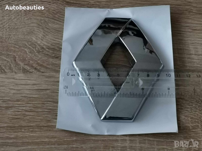 Нова сребриста емблема Renault с размери - 12 см X 9.6 сm. Размерите са дадени на снимките. Емблемите са с двойнозалепящо лепило, без щифтове. Цената е за 1 бр.