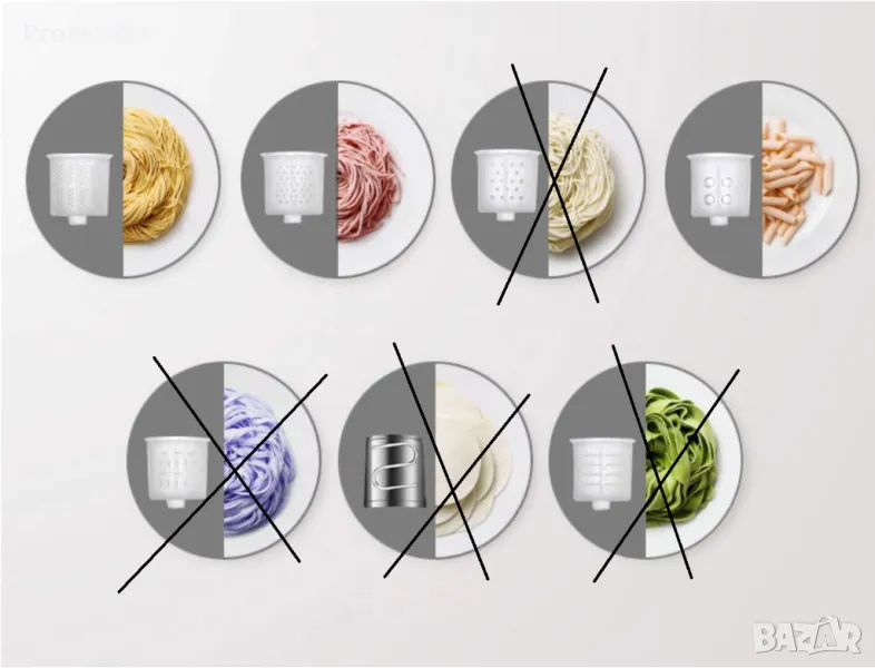 След като е готово тестото изберете приставката, която искате да използвате, като в комплекта са включени 7 броя приставки за различни видове паста, като 3 вида спагети, талиатели, фетучини, пене и лазаня.