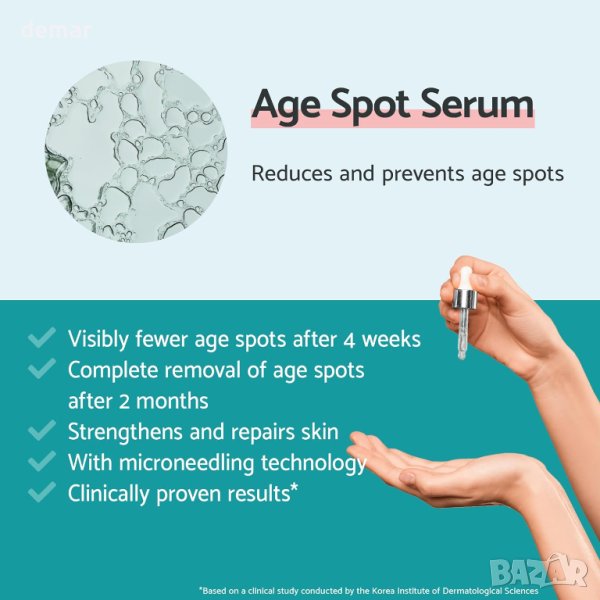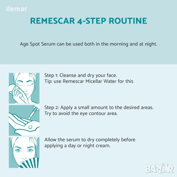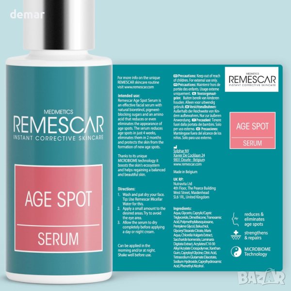 Remescar Age Spot Serum е клинично доказано решение за намаляване на старческите петна само за 4 седмици, с потенциал да ги накара да изчезнат в рамките на два месеца. Той също така предотвратява образуването на нови старчески петна по кожата ви. Тези възрастови петна, често срещани сред тези над 40 години, са форма на хиперпигментация, която често се среща на изложени на слънце области като лицето, ръцете, раменете и деколтето. Този серум, включващ три активни съставки, включително Bakuchiol, антипигментни захари и аминокиселини, лесно се интегрира в ежедневната ви рутинна грижа за кожата за ефективно справяне и контрол на хиперпигментацията. Постигнете видими резултати само за 4 седмици с ежедневна употреба. Научно базираните решения за грижа за кожата на Remescar са предназначени да повишат вашето самочувствие и да се справят с проблемите на кожата, всички подкрепени от клинична безопасност и ефективност.