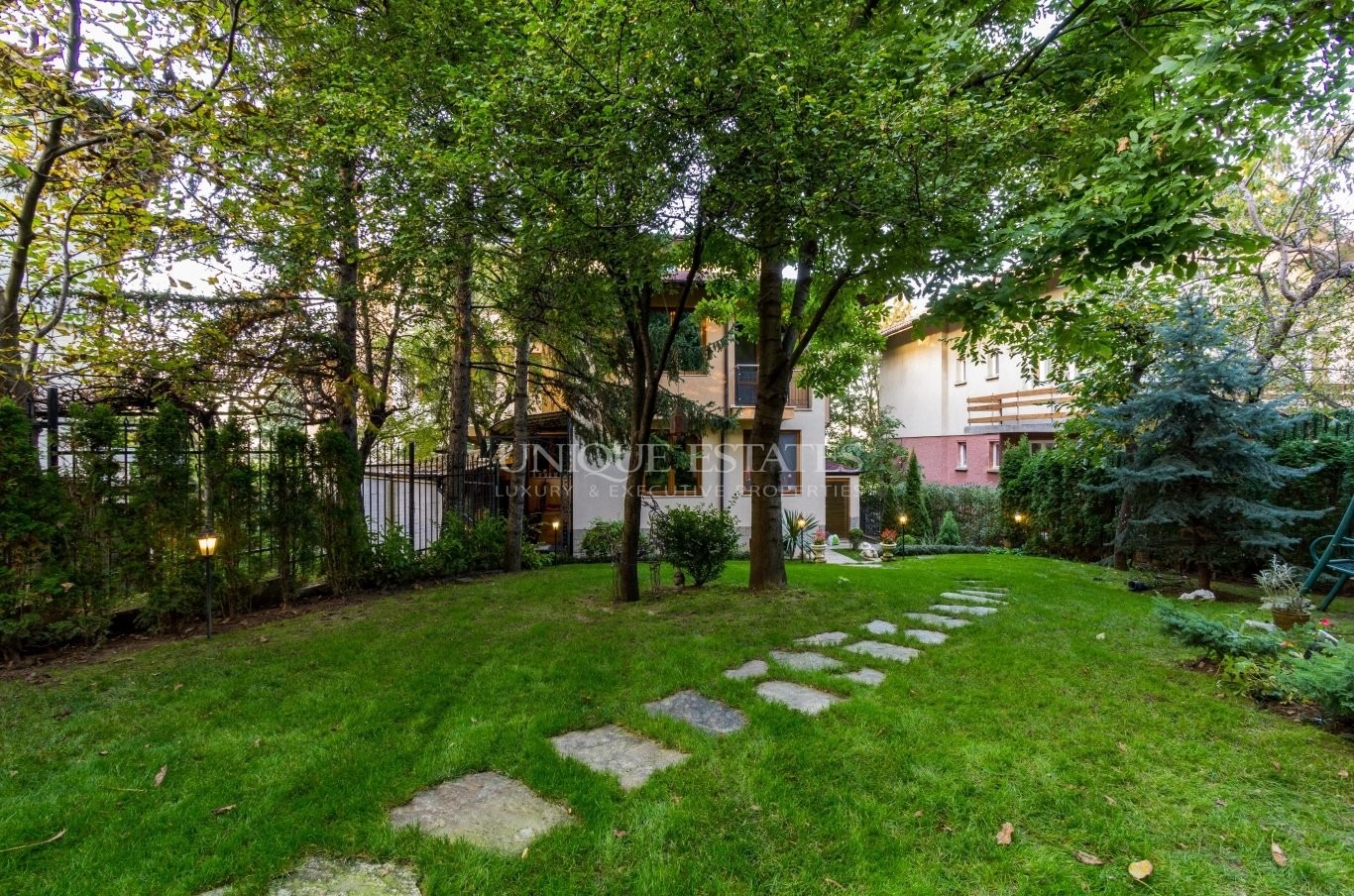 Двор: озеленен двор с алеи, автоматична напоителна система, барбекю, закрит кът с мебели от ковано желязо