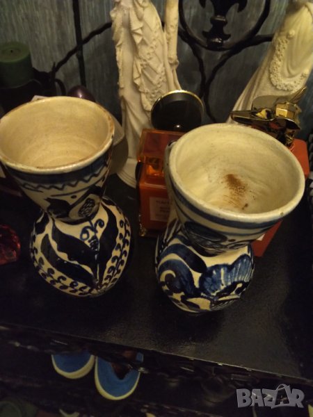 каничките са правени пред очите ми гланцирана португалска керамика ,размерите им са една 17 висока диаметур6 и другата 18 висока диаметър 8 см ,продават се само като лот не ги разделям ,маркирана е годината на производство ,имат леки чипчета съвсем минимални по едната на гърлото ............крайна цена