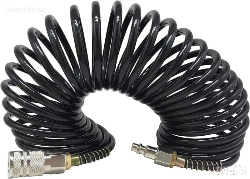 Спирален, пневматичен маркуч. Необходим за работа с всеки компресор. Оборудван с бързи връзки - съединители, към него може да се свърже всяко пневматично устройство. Изключително качествени и здрави!