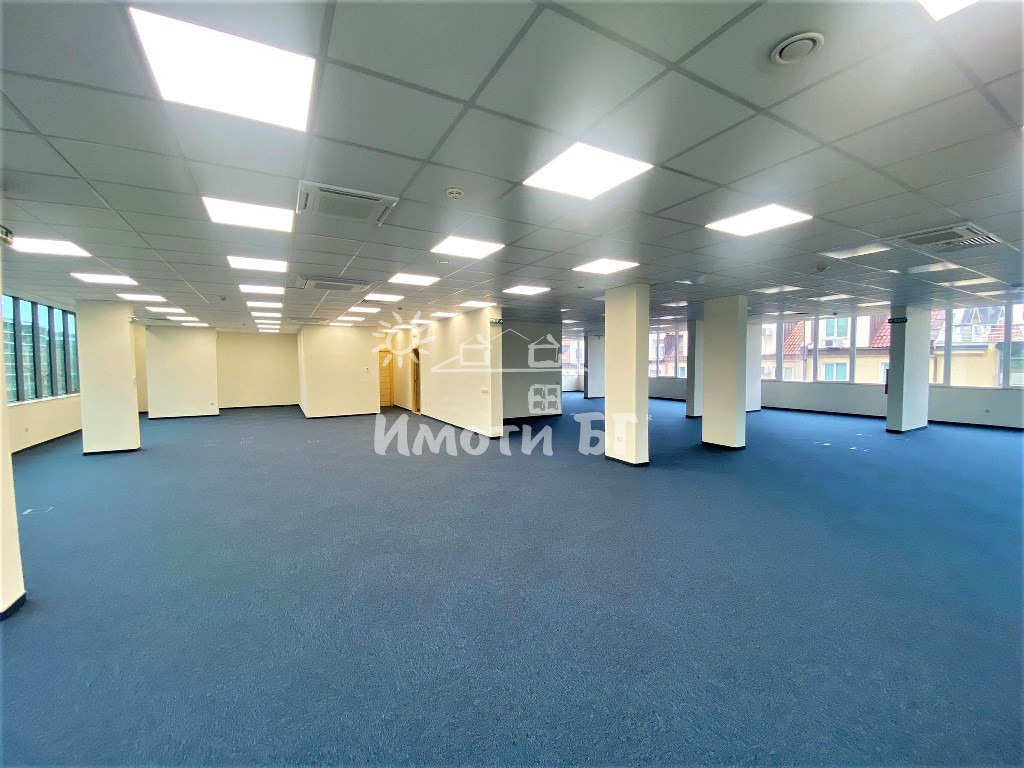 Офисът се състои от четири Open space пространства, 2 рецепции, оборудвани санитарни възли и кухненски бокс, след извършен цялостен ремонт - с поставена настилка висок клас мокет, стени с латекс и окачен таван. Възможност за преграждане според нуждите на наемателя!