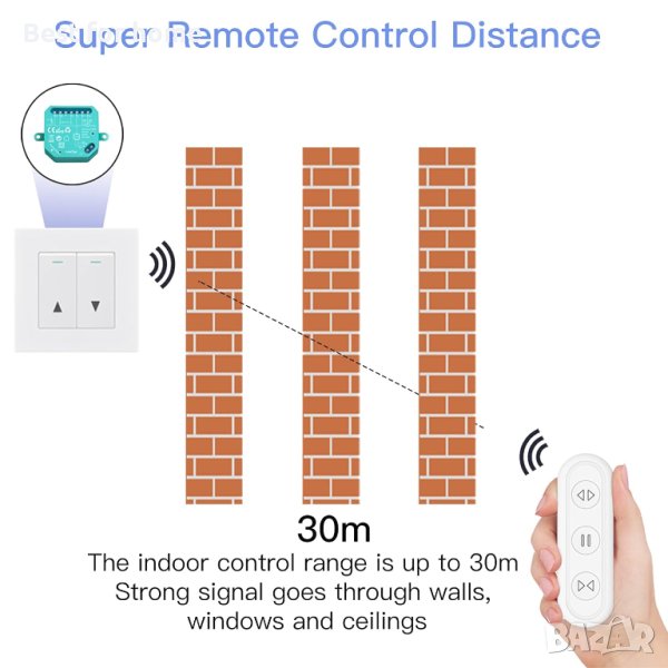 - Голямо разстояние за управление: Обхватът на предавателя е до 30 m и контролът е ефективен и през стените.