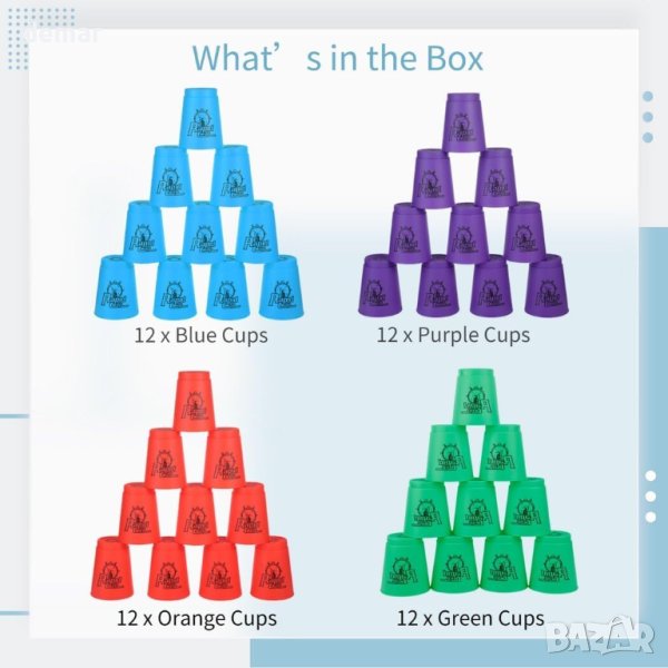 Изживейте света на развиващите игри с нашия комплект Sport Stacking. Това е фантастично занимание, което подобрява фитнеса, ловкостта, концентрацията и бързината. Независимо дали подреждате, гнездите или правите чаши, той насърчава фините двигателни умения и координацията око-ръка. С 48 чаши в 4 живи цвята и 3 малки вентилационни отвора за намалено въздушно триене можете да ускорите ефективността на подреждането. Тази класическа играчка за подреждане е подходяща за всички възрасти, от деца до възрастни, което я прави идеална за срещи, уикенди и празници. Матираната повърхност против хлъзгане осигурява сигурно захващане, дори по време на състезания по бързо подреждане. Пригответе се за купчина забавления!