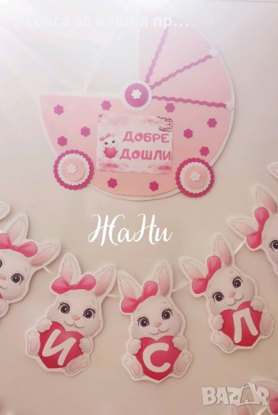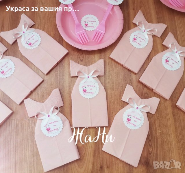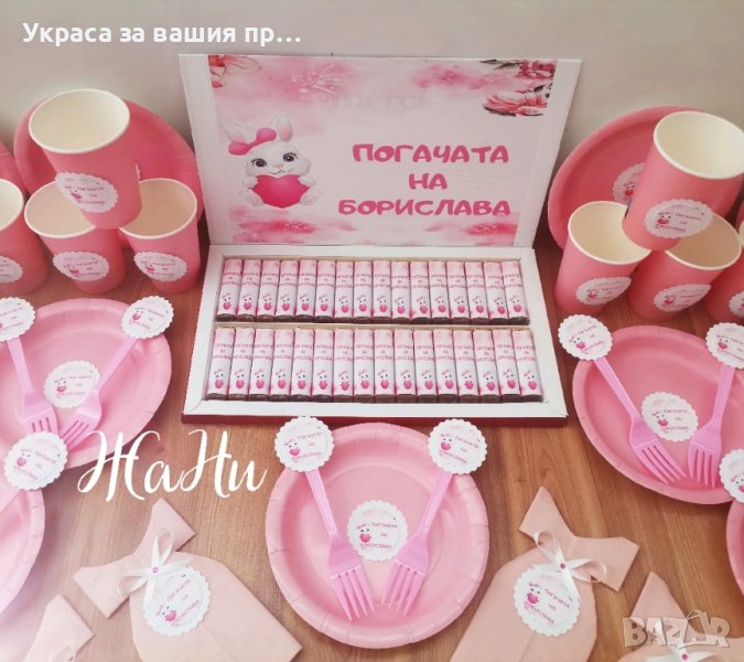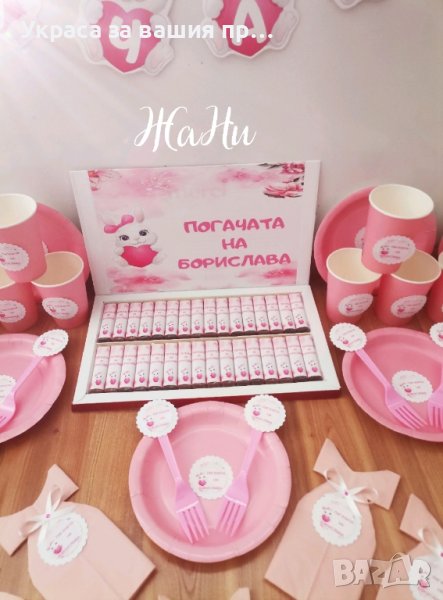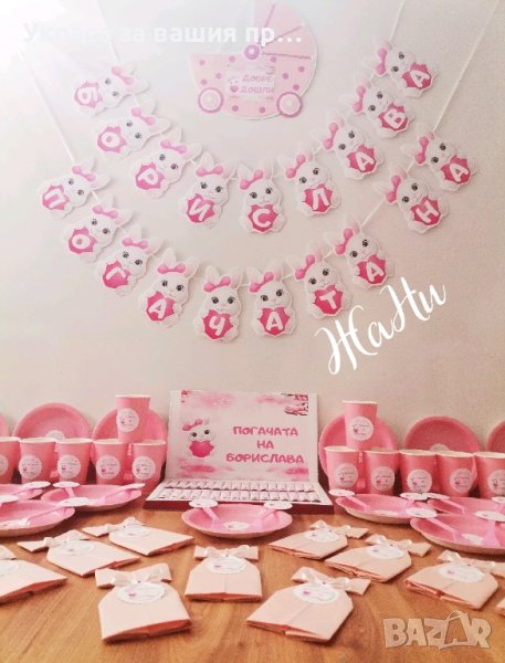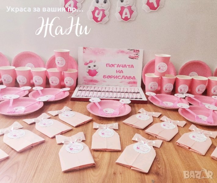 Украса За бебешка погачаВсеки клиент сам избира какви аксесоари желае да включва украсата, както и нужната бройка. * надпис* Месал за разчупване на питката с името на детето и датата (печат /текстилно фолио)* малка кърпичка за паричките с име *боди с име и дизайн съобразен с темата на празника *бонбони с дизайн съобразен с темата на празника *книга за пожелания с химикал * карти за пожеланията на орисниците, може да се поставят в папка * топки и цветя от тишу за украса * чаши * чинийки * вилички * Сламки* Салфетки боди/рокля/риза/едноцветни с декорация по темата * топери с пожелания за орисане на бебе кръгли или във форма на животни, със снимка на детето или с надпис по поръчка за украса или подаръчета за гостите *Украса За маса * стойка за мъфини* топери за мъфини *табела за врата и за маса * табела бебешко шише * табела бебешка количка с надпис * Покани * подаръчета за гостите