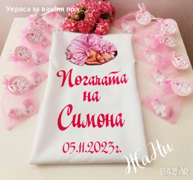 Украса За бебешка погачаВсеки клиент сам избира какви аксесоари желае да включва украсата, както и нужната бройка. * надпис* Месал за разчупване на питката с името на детето и датата (печат /текстилно фолио)* малка кърпичка за паричките с име *боди с име и дизайн съобразен с темата на празника *бонбони с дизайн съобразен с темата на празника *книга за пожелания с химикал * карти за пожеланията на орисниците, може да се поставят в папка * топки и цветя от тишу за украса * чаши * чинийки * вилички * Сламки* Салфетки боди/рокля/риза/едноцветни с декорация по темата * топери с пожелания за орисане на бебе кръгли или във форма на животни, със снимка на детето или с надпис по поръчка за украса или подаръчета за гостите *Украса За маса * стойка за мъфини* топери за мъфини *табела за врата и за маса * табела бебешко шише * табела бебешка количка с надпис * Покани * подаръчета за гостите