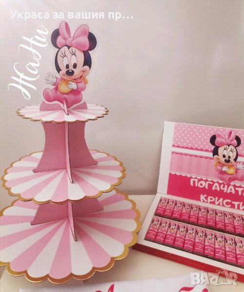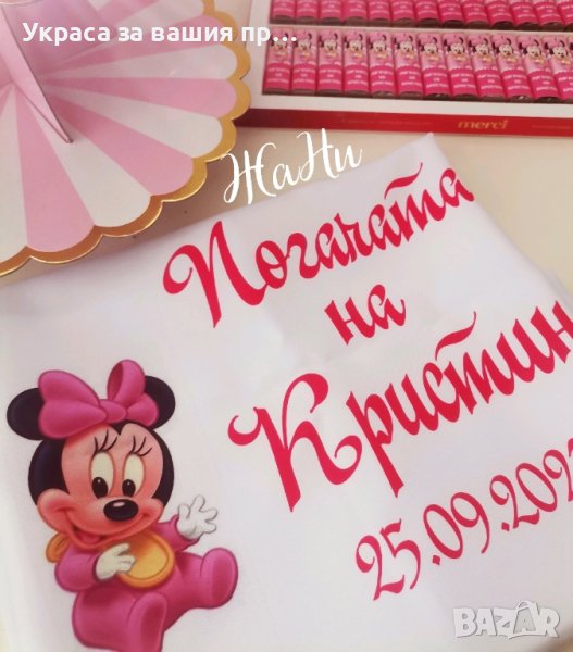 Украса За бебешка погачаВсеки клиент сам избира какви аксесоари желае да включва украсата, както и нужната бройка. * надпис* Месал за разчупване на питката с името на детето и датата (печат /текстилно фолио)* малка кърпичка за паричките с име *боди с име и дизайн съобразен с темата на празника *бонбони с дизайн съобразен с темата на празника *книга за пожелания с химикал * карти за пожеланията на орисниците, може да се поставят в папка * топки и цветя от тишу за украса * чаши * чинийки * вилички * Сламки* Салфетки боди/рокля/риза/едноцветни с декорация по темата * топери с пожелания за орисане на бебе кръгли или във форма на животни, със снимка на детето или с надпис по поръчка за украса или подаръчета за гостите *Украса За маса * стойка за мъфини* топери за мъфини *табела за врата и за маса * табела бебешко шише * табела бебешка количка с надпис * Покани * подаръчета за гостите