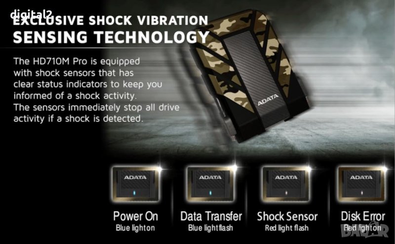 Външен твърд диск отличен с най - високия клас за удароустойчивост и влагоустойчивост . Военен сертификат за работа в тежки условия . Специален абсорбиращ гумиран слой и многопластов корпус осигуряващ максимална надежност и защита за вашите данни . Един от най здравите дискове отличен с множество награди и сертификати в света . Осигурете максимална защита на вашата информация .