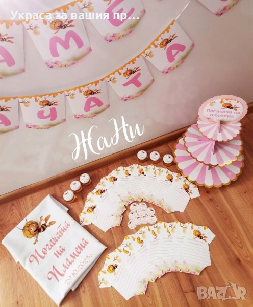 Украса За бебешка погачаВсеки клиент сам избира какви аксесоари желае да включва украсата, както и нужната бройка. * надпис* Месал за разчупване на питката с името на детето и датата (печат /текстилно фолио)* малка кърпичка за паричките с име *боди с име и дизайн съобразен с темата на празника *бонбони с дизайн съобразен с темата на празника *книга за пожелания с химикал * карти за пожеланията на орисниците, може да се поставят в папка * топки и цветя от тишу за украса * чаши * чинийки * вилички * Сламки* Салфетки боди/рокля/риза/едноцветни с декорация по темата * топери с пожелания за орисане на бебе кръгли или във форма на животни, със снимка на детето или с надпис по поръчка за украса или подаръчета за гостите *Украса За маса * стойка за мъфини* топери за мъфини *табела за врата и за маса * табела бебешко шише * табела бебешка количка с надпис * Покани * подаръчета за гостите