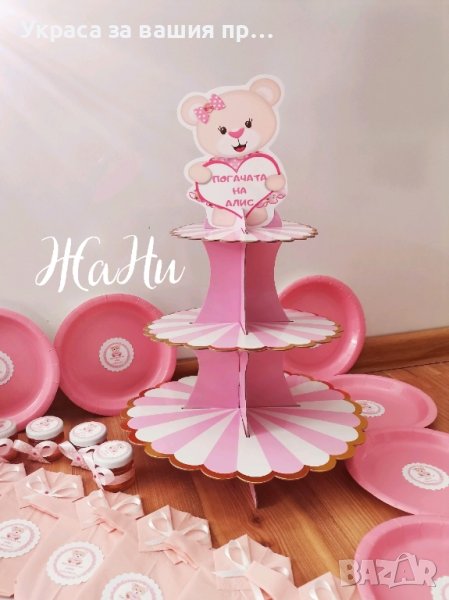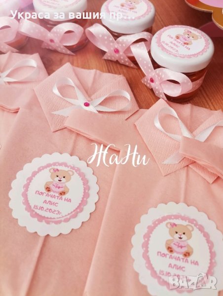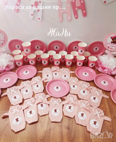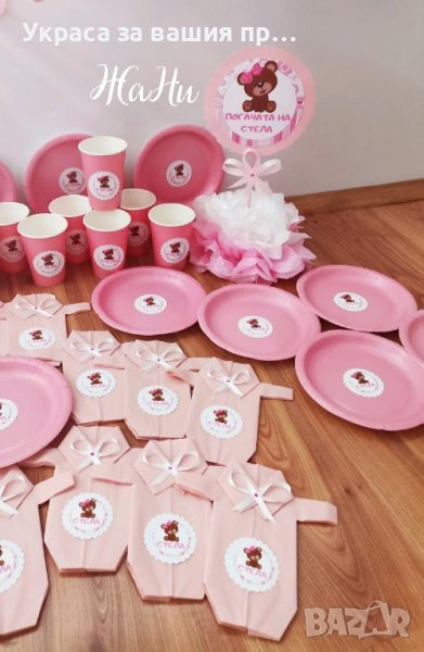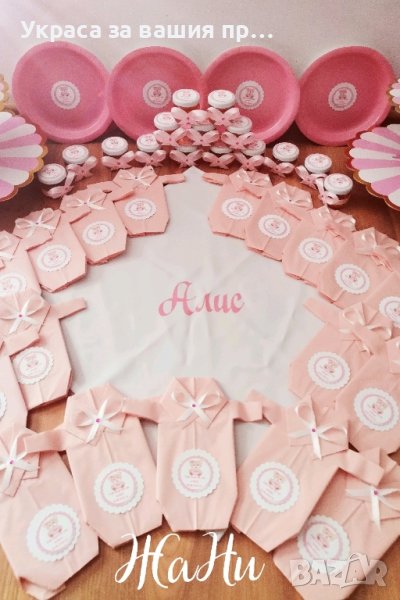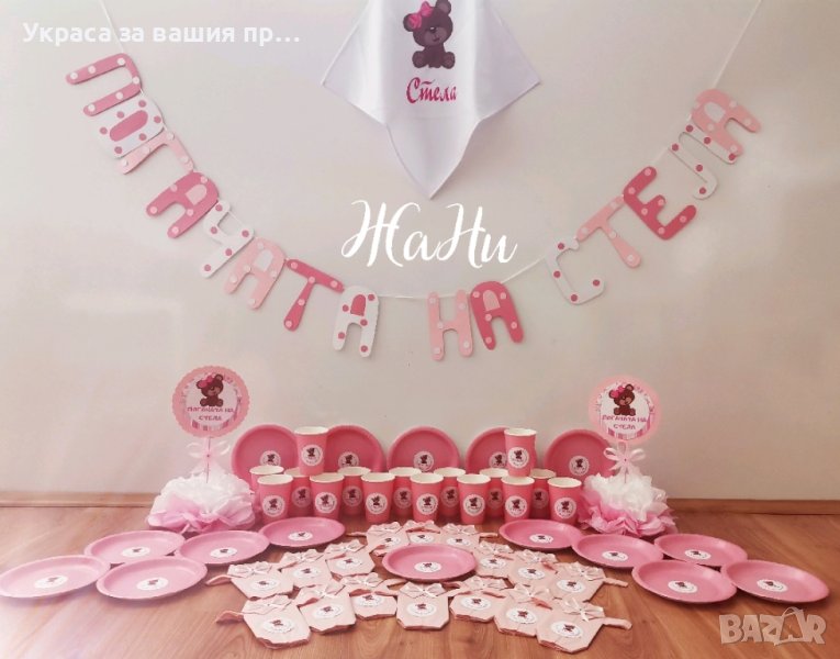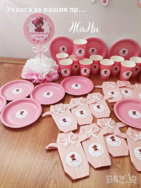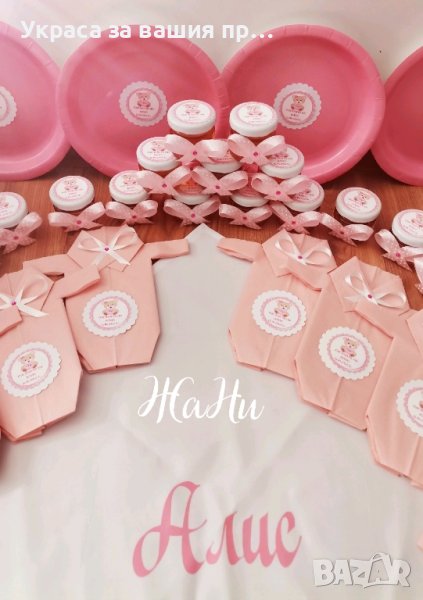 Украса За бебешка погачаВсеки клиент сам избира какви аксесоари желае да включва украсата, както и нужната бройка. * надпис* Месал за разчупване на питката с името на детето и датата (печат /текстилно фолио)* малка кърпичка за паричките с име *боди с име и дизайн съобразен с темата на празника *бонбони с дизайн съобразен с темата на празника *книга за пожелания с химикал * карти за пожеланията на орисниците, може да се поставят в папка * топки и цветя от тишу за украса * чаши * чинийки * вилички * Сламки* Салфетки боди/рокля/риза/едноцветни с декорация по темата * топери с пожелания за орисане на бебе кръгли или във форма на животни, със снимка на детето или с надпис по поръчка за украса или подаръчета за гостите *Украса За маса * стойка за мъфини* топери за мъфини *табела за врата и за маса * табела бебешко шише * табела бебешка количка с надпис * Покани * подаръчета за гостите
