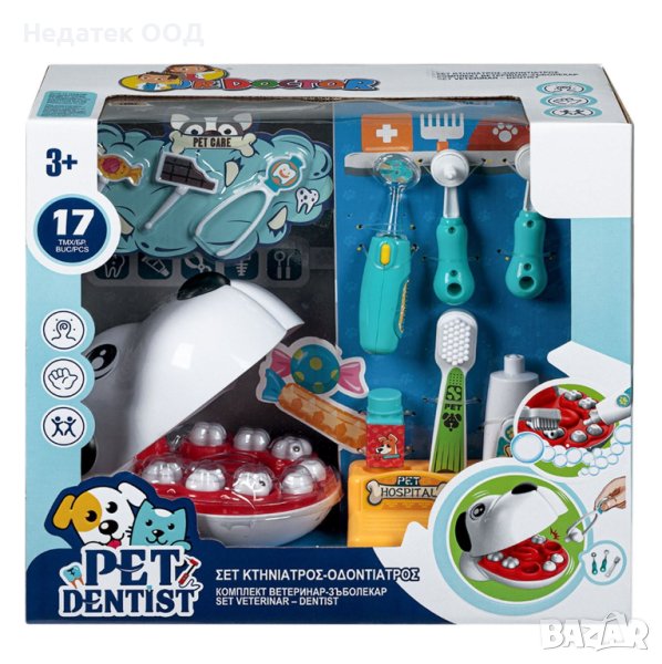 Кучето има нужда от грижи за зъбите си. Ветеринарният лекар - зъболекар отстранява повредените му зъби, проверява устната му хигиена и измива зъбите му със специалната паста за животни. Стоматологичното огледало има светлина, а ваденето на зъб има звук. Играта на преструвки помага на децата да развият своите интелектуални умения и да формират своя характер. Работи с 2 батерии тип AG10 (включени).