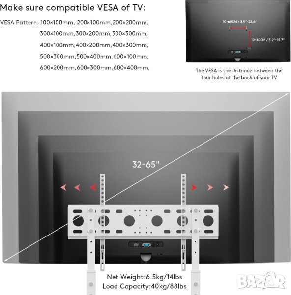 32”-65” (VESA от 100x100mm до 600x400mm) телевизор до стената, без да е