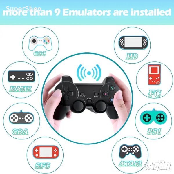 Поддържа 9 игрови симулатора: MAME/FC/GB/GBA/GBC/MD/SFC/PS1 - Playstation 1/ATARI2600/ATARI7800. А двата безжични джойстика в комплекта са черешката на тортата. Гладки линии, опростен и красив дизайн, plug and play, безжични джойстици, с обхват на управление до 8 метра. В сравнение с кабелните джойстици с къси кабели, безжичните избягват приближаването до телевизора и предпазват очите ви по-ефективно. HD изход: Поддържа 4k телевизионен видео сигнал с висока разделителна способност (1080p / 720p) и монитори и с HDMI вход.