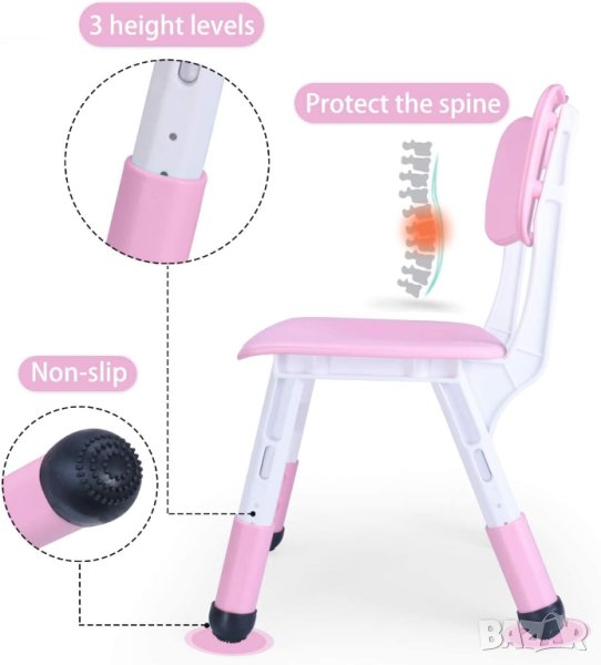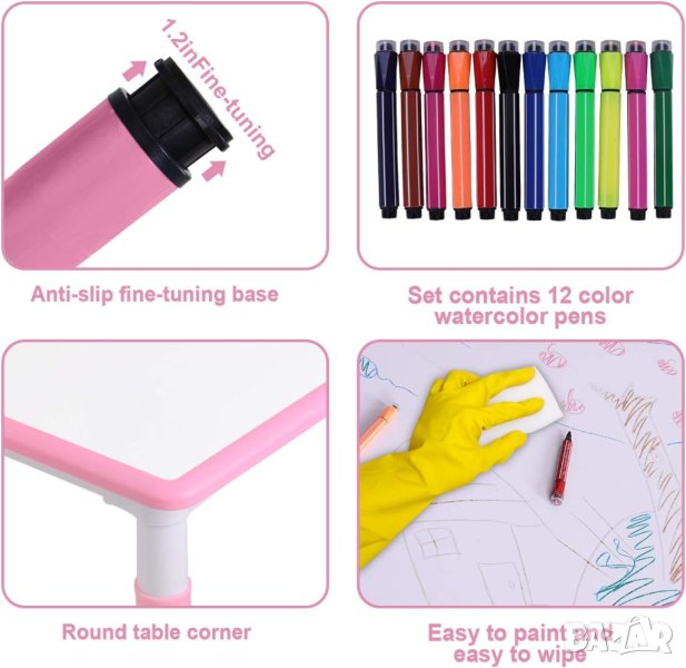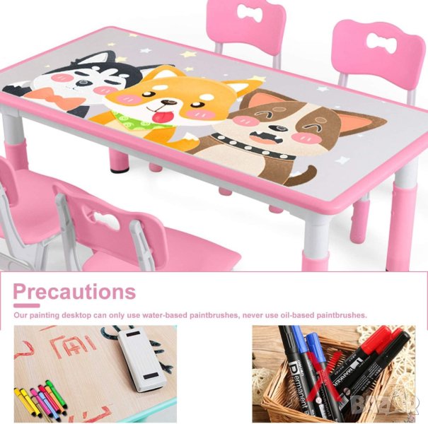 На този комплект детето Ви може не само да чете, учи, яде, да прави домашни, да играе с кубчета върху пластмасовото бюро, но по-важното е, че може да рисува върху масата и след рисуване, го почистите лесно с парцал.