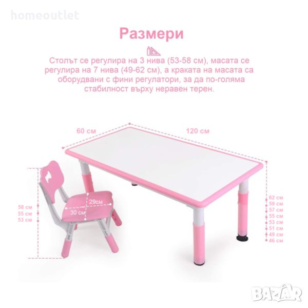 Масата има 7 нива с височина от 46 до 62 см, докато столът има 3 нива на височина от 53 до 58 см.
