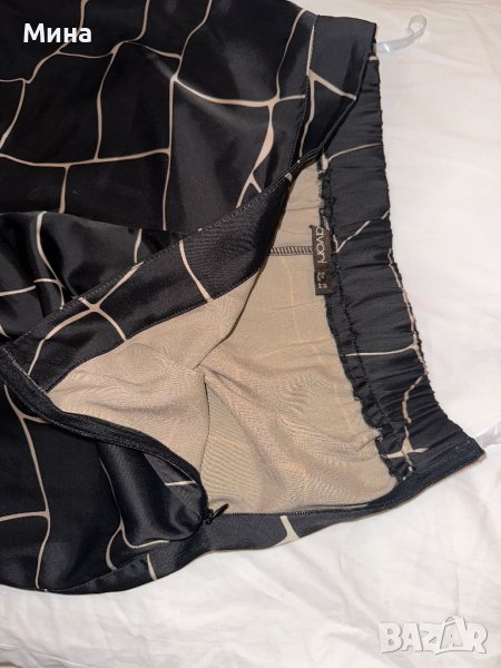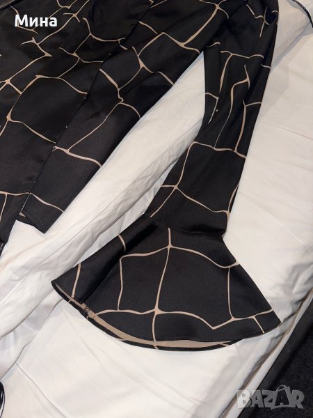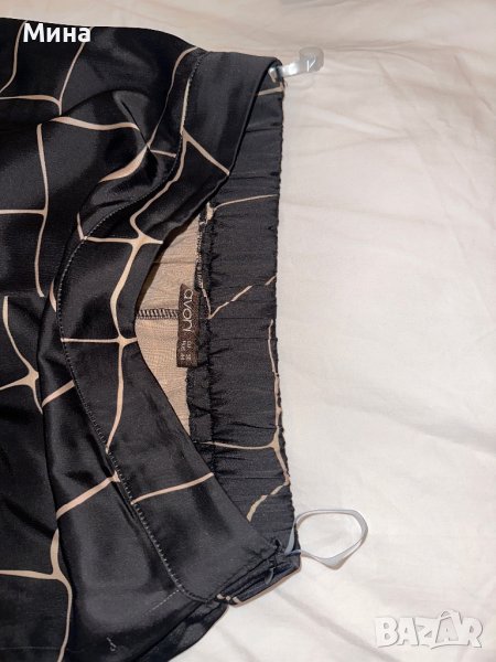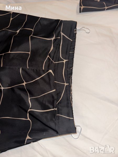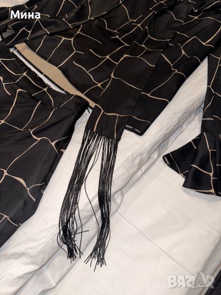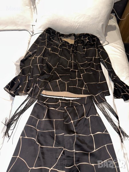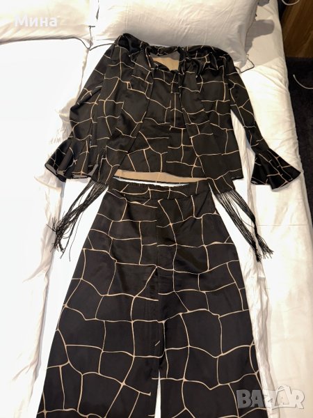 Дамски сатенен сет от риза и панталон, ризата има интересни елементи с ресни, панталонът има ластик отзад и цип отляво, удобен е за ежедневието и за по-официални поводи. Обличан е веднъж за събитие. Могат да се носят и по отделно и да се съчетават в различни визии.