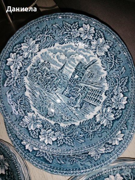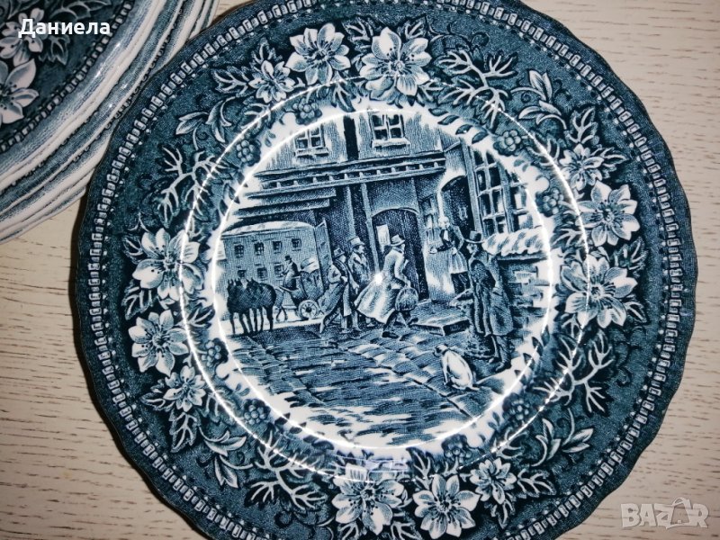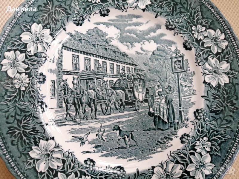 Английски сервиз за хранене с богато изрисувани различни сцени. Състои се от чинии и купи в зелен цвят, налични в следните бройки и размери: