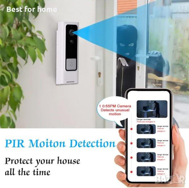 Откриване на движение: Вграден PIR сензор за безжична видеокамера за звънец, който ви позволява да получавате аларма и насочени известия в реално време при всяко задействано откриване на човек. Помага ви да поддържате безопасността, като виждате кой е на вратата ви, без да я отваряте
