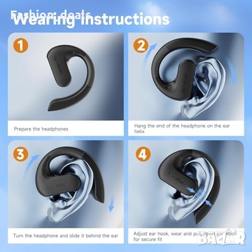 Ергономичен дизайн с регулируеми ушни куки за комфорт при носене.