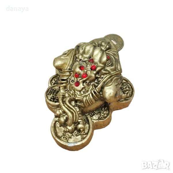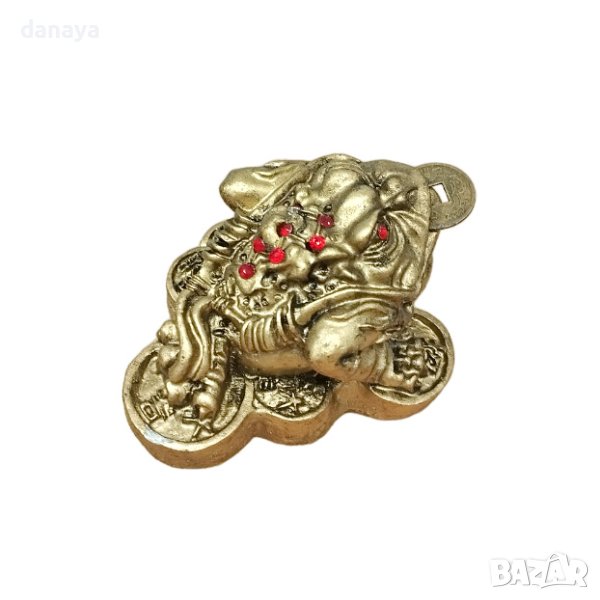 Сувенир трикрака жаба на парите и късмета. Един от най-ефективните и най-известни талисмани – символи на Фън Шуй. Трикраката жаба на парите и късмета е декорирана с монети и камъни, с паричка в устата. Този талисман притежава изключителна сила да привлича богатството към притежателя си.