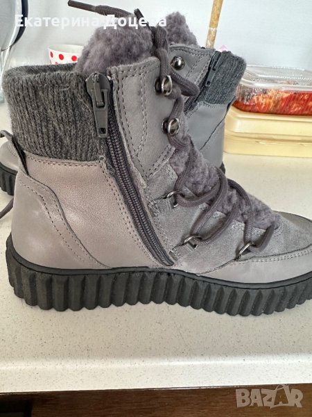 Сиви боти с пух, цип и връзки от естествена кожа. Топли и удобни на марката Марко Поло. Цена по етикет 159 лв, предлагат се за 90 лв.