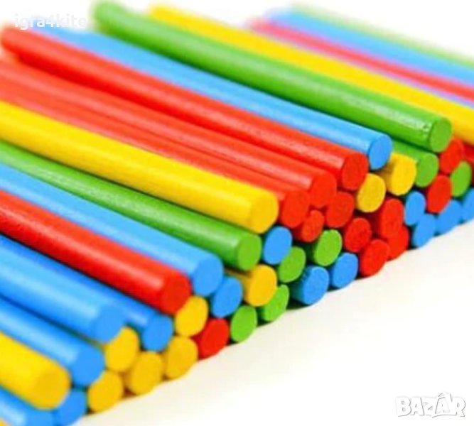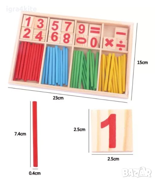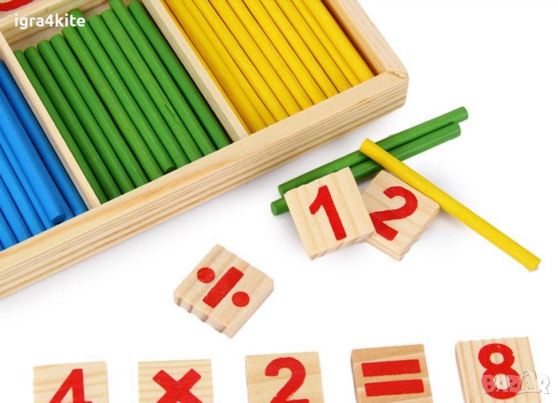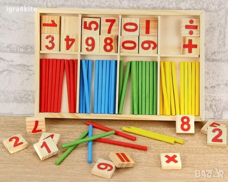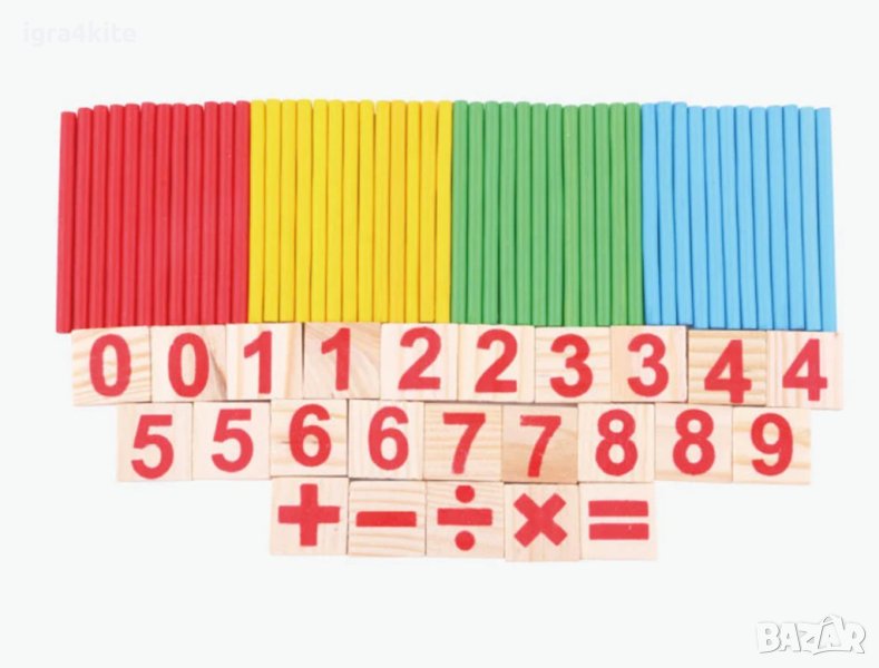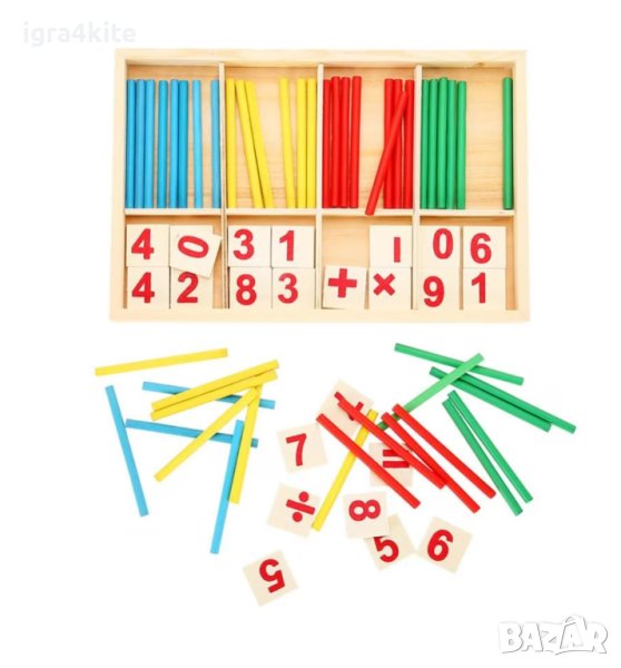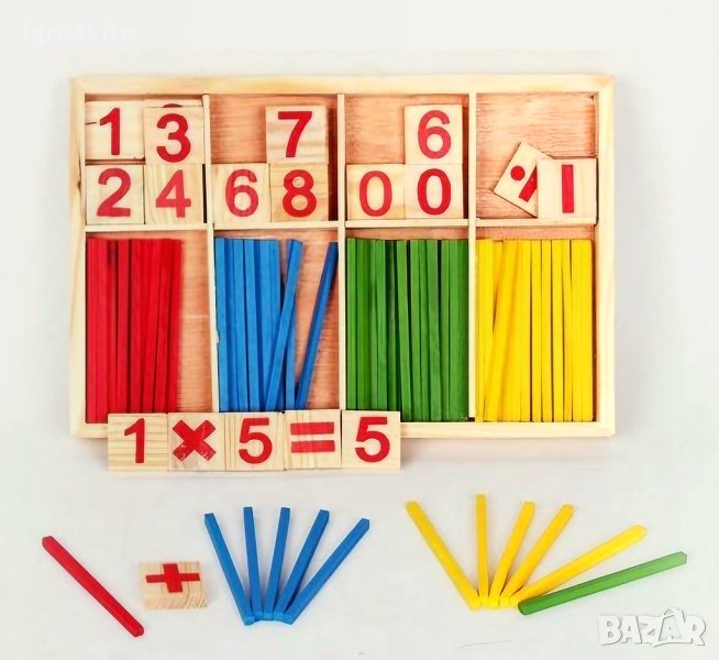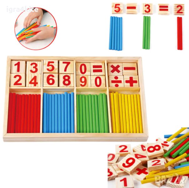 Умножение, деление, събиране, изваждане, равно, въпросителна Х 2 от всеки знак + множество дървени пръчици в различни 4 цвята и р-се числата от 0 до 9