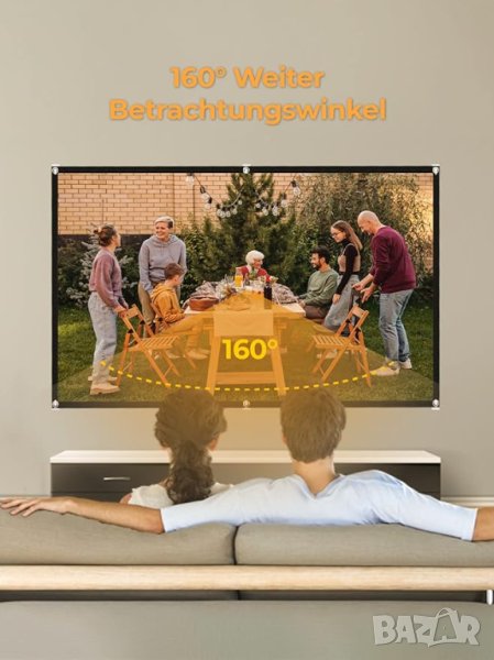 - По-голям зрителен ъгъл: с прожекционния екран можете да достигнете зрителен ъгъл от 160°. В рамките на този диапазон на зрителен ъгъл можете сами да изберете най-удобния зрителен ъгъл. Семейството и приятелите могат да гледат филма заедно, без да се налага да се стесняват. Голям фон с много пространство, насладете се на вашето приключенско филмово пътешествие