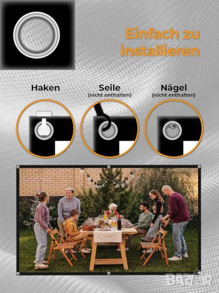 - Преносим и лесен за инсталиране: Прожекционният екран може да се сгъне до малък размер и може да се постави в раница или куфар, така че лесно да го вземете със себе си. Най-важното е, че този външен киноекран е оборудван с кукички и стикери, така че настройката му отнема само 5 минути.