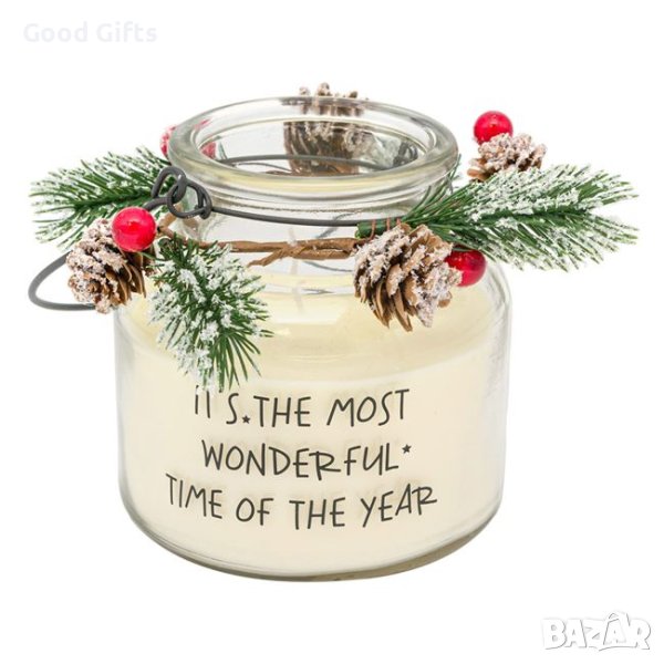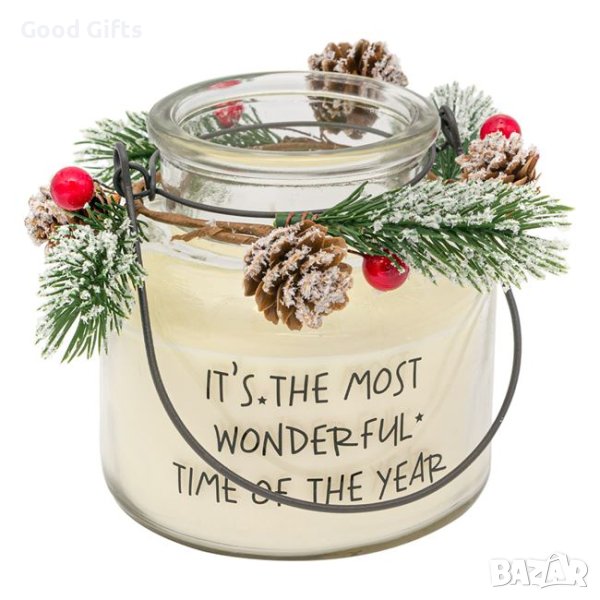 Коледна бяла свещ в прозрачен буркан с послание, борова клонка с шишарки и дръжка.