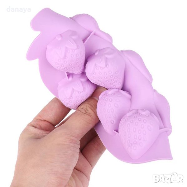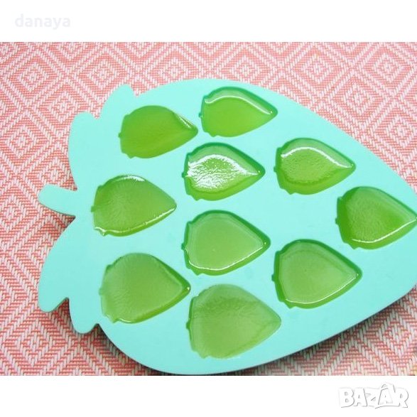 Силиконова форма за шоколадови бонбони, форма за лед, бисквитки или дребни сладки с форма на ягодки. Самата тавичка също е с форма на ягода. Подходяща за печене и замразяване.