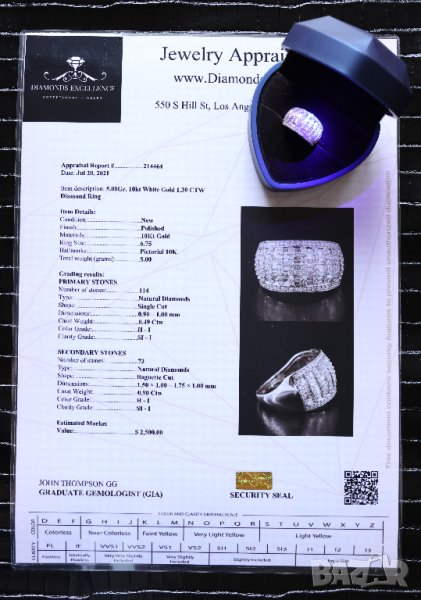 - Два броя сертификати - оценителен доклад на бижуто направен в Лос Анджелис и цялостен лабораторен анализ за естествения произход на диамантите направен в България.