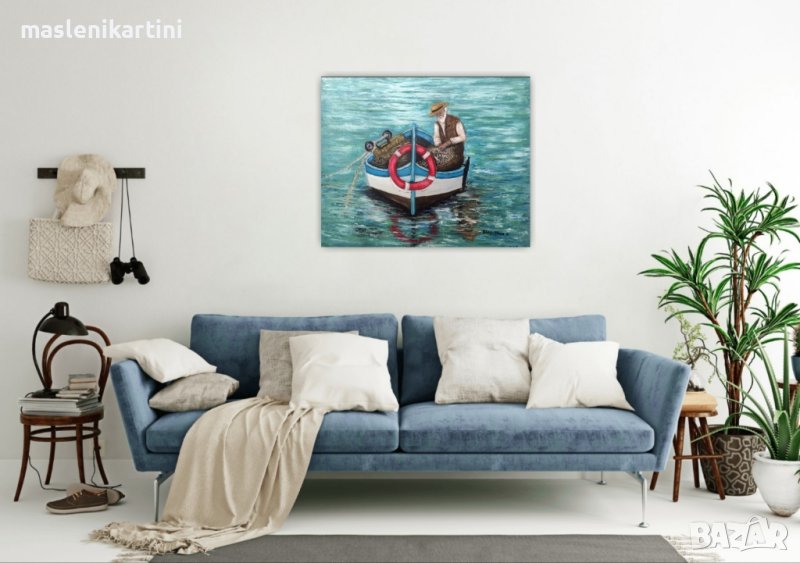 Старият рибар. Ръчно рисувана картина с маслени бои върху платно. Оригинал . Художник Валентина Костадинова. Размер с рамка 70/60 см, без рамка 60/50 см. Картината ще бъде рамкирана безплатно. Безплатна доставка с наложен платеж и опция преглед до офис на Еконт. Директно от художничката.