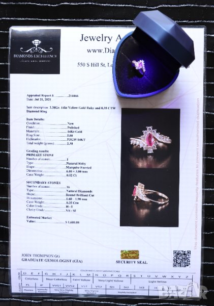 - Два броя сертификати - оценителен доклад на бижуто направен в Лос Анджелис на стойност 1600$ и цялостен лабораторен анализ за естествения произход на диамантите направен в България.