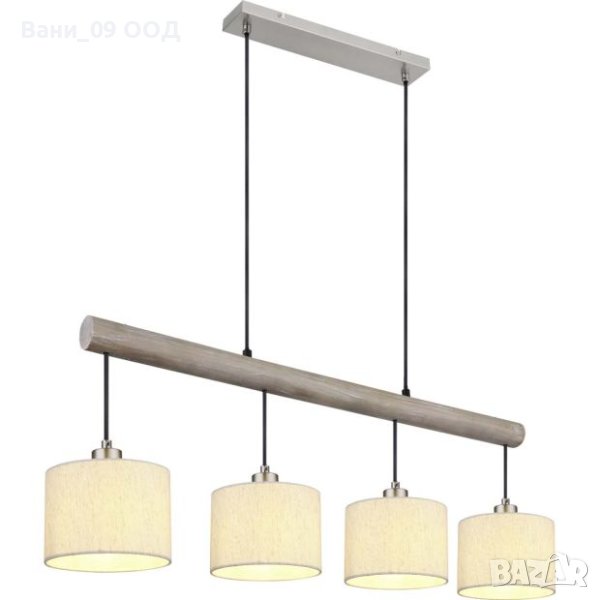 Прибавянето на акцент с естествена дървесина в детайл или в цяла композиция в интериорното проектиране, е водещо в съвременния дизайн. Резултатът винаги е привлекателен и заинтригуващ - в пространството се обособява зона, съчетаваща модерно излъчване с неустоимия натурален чар на природата. Този голям осветител с 4 красиви текстилни абажура в меки нюанси, комбиниран с държач от естествена твърда дървесина, аранжира помещението, облагородявайки с ефектен силует. Уютът е налице, а универсалната визия е подходяща за най-разнообразни стилови концепции. Спуснете LED пендела над трапезната маса и се насладете на една по-различна атмосфера