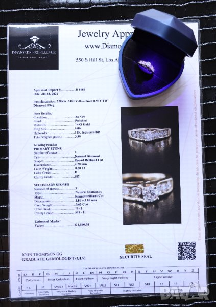 - Два броя сертификати - оценителен доклад на бижуто направен в Лос Анджелис и цялостен лабораторен анализ за естествения произход на диамантите направен в България.