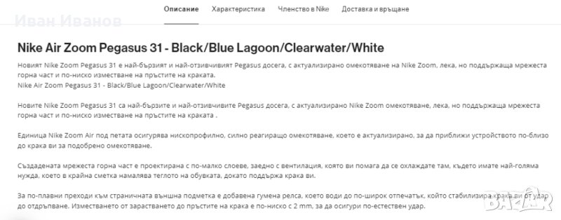 Nike Zoom Pegasus 31 е сериозна маратонка за бягане, която е по-лека и по-бърза от всеки предишен модел на Pegasus. Те разполагат с дишаща горна част от Engineered Mesh, проектирано седло в средата на стъпалото, Zoom единица в петата и crash rail външна подметка, която осигурява плавен преход.