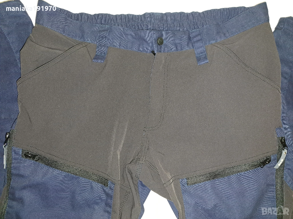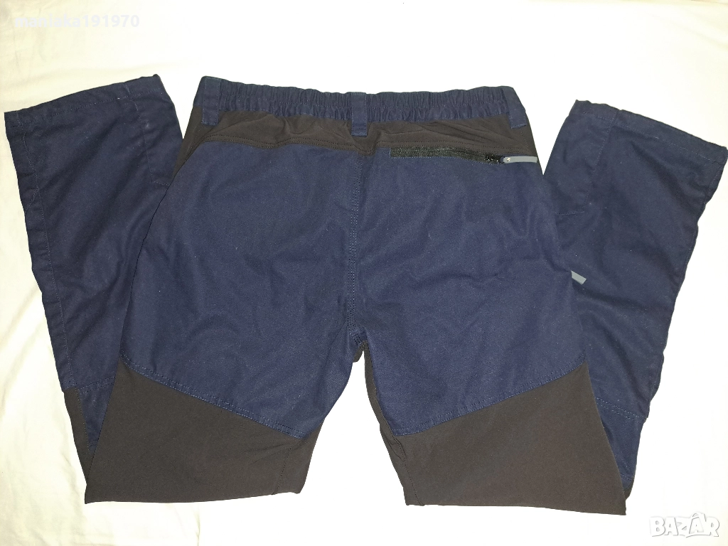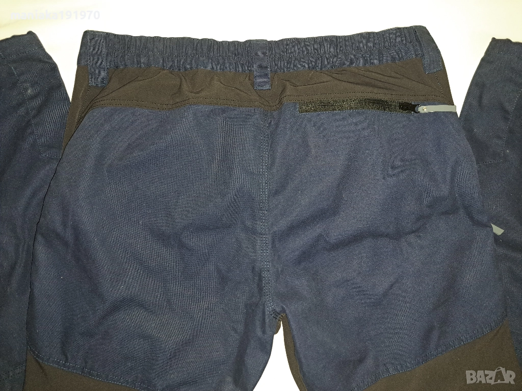 Размер (XXL) Цвят, тъмно синьо и каки.Разтеглива материя където е в кафяво.Множество джобове,вентилационни отвори с мрежа отстрани на бедрата.Оластечени отзад на талията ,регулируеми долу на глезените,усилени тройни шевове където е необходимо.Стават за ежедневно носене и за туризъм.