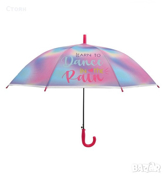 Чадър за дъжд в цветовете на дъгата, полупрозрачен с надпис „Научете се да танцувате в дъжда“. Има извита дръжка и механизъм за автоматично отваряне.