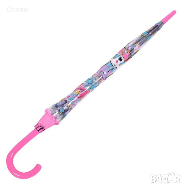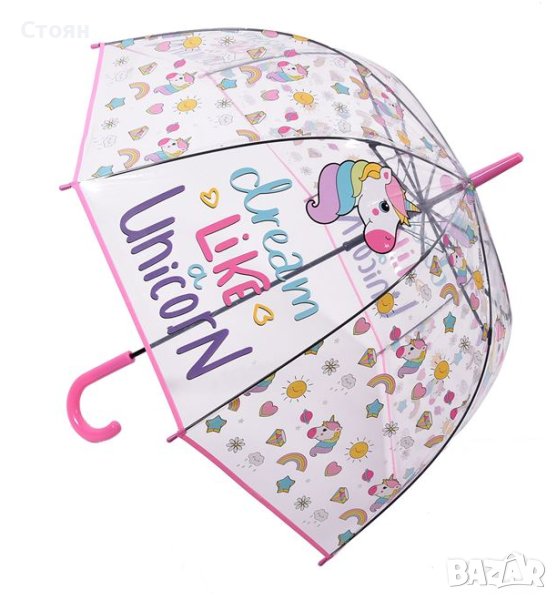 Чадър за дъжд, прозрачен с дизайн на еднорог и послание "Dream Like Unicorn". Има розова извита дръжка и механизъм за автоматично отваряне.