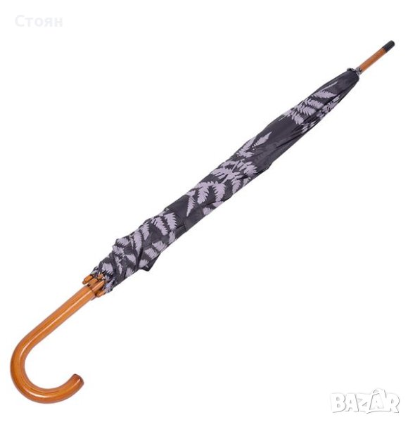 Чадър за дъжд в черен цвят с дизайн на папратови листа в 2 нюанса. Има дървена извита кафява дръжка и механизъм за автоматично отваряне.