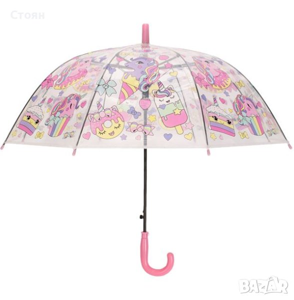 Чадър за дъжд, прозрачен, с десен на еднорози и пастелни цветове. Има извита розова дръжка и механизъм за автоматично отваряне.
