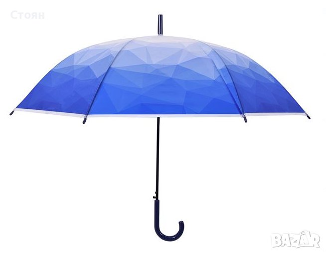 Чадър за дъжд в цвят син раф, бяло и градиентен дизайн. Има синя извита дръжка и механизъм за автоматично отваряне.