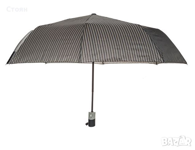 Чадър за дъжд с шарка на кафяви райета и калъф за съхранение. Има дръжка с гумен стил и разполага с механизъм за автоматично отваряне.