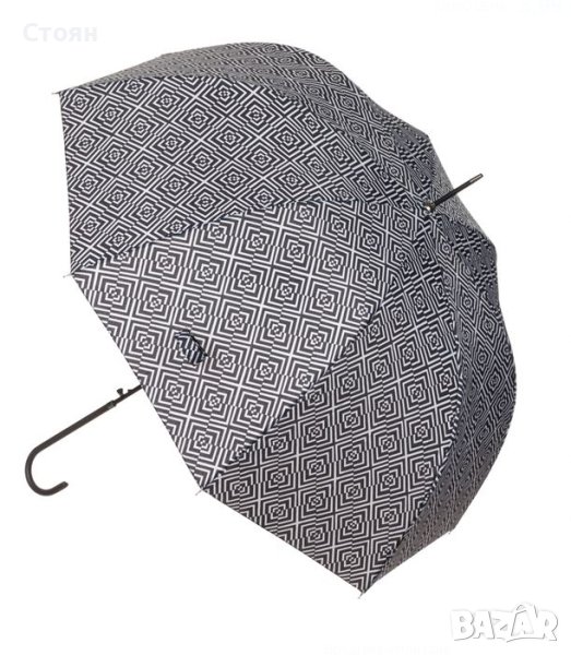 Чадър за дъжд в черно бяло с повтарящ се диамантен мотив. Има извита дръжка и механизъм за автоматично отваряне.