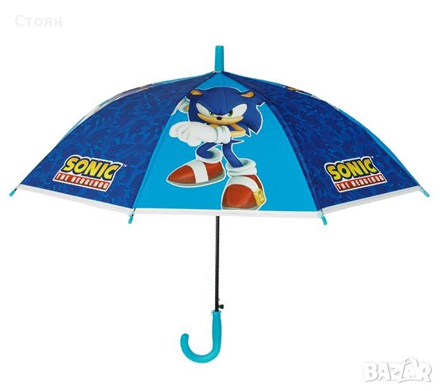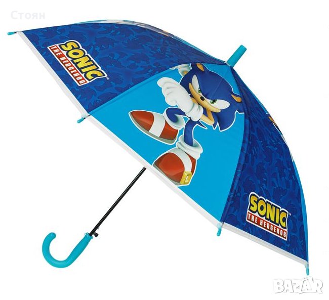 Чадър за дъжд в син цвят с дизайн Sonic. Има извита дръжка и механизъм за автоматично отваряне.
