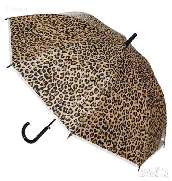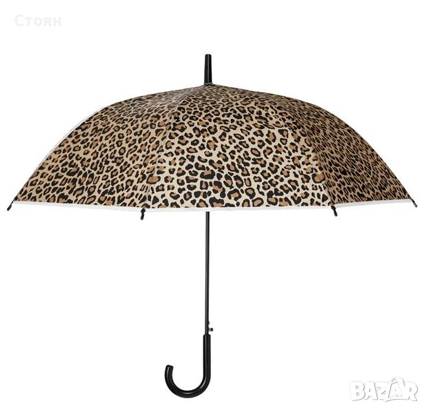 Полупрозрачен леопардов чадър за дъжд. Има извита дръжка и механизъм за автоматично отваряне.