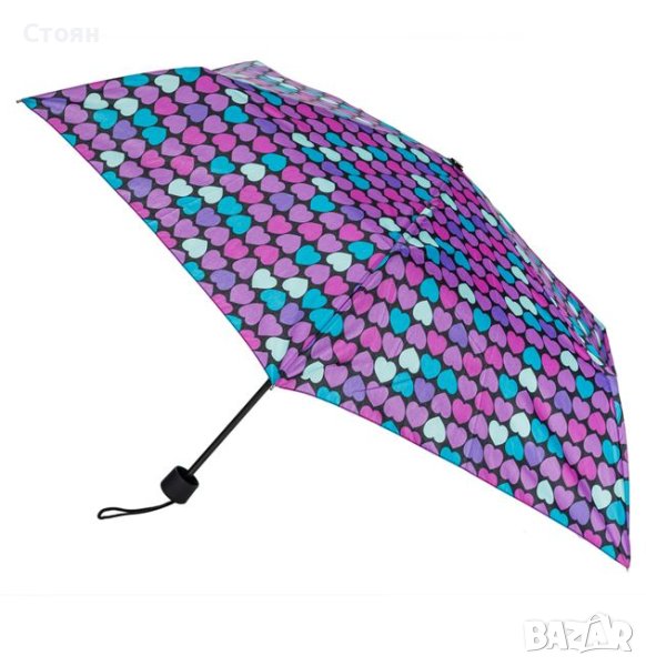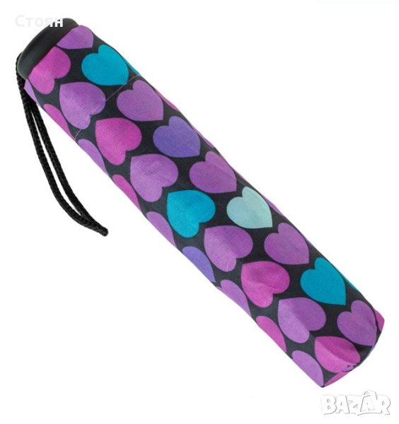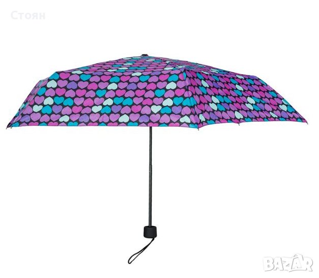 Чадър за дъжд с дизайн на цветни сърца и калъф за съхранение. Разполага с механизъм за ръчно отваряне.