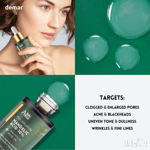 Нашият серум с бадемова киселина 10% със салицилова киселина е идеално решение за кожата, което нежно ексфолира, минимизира порите и се бори с бръчките. Освен това изравнява тена на кожата, намалява хиперпигментацията и успокоява с нежната си формула. Започнете с 1-2 капки, увеличавайте постепенно за по-мека, гладка и сияйна кожа. Нашата формула е безопасна, без аромати и подходяща за всички типове кожа, включително склонна към акне и мазна кожа.
