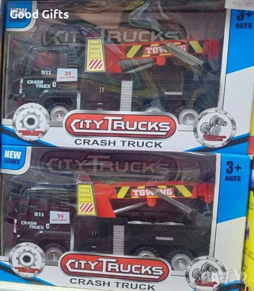 Детският автомобил за пътна помощ City trucks е с много детайлна изработка. Използваните материали са пластмаса и метал. Цветовете са червен, сив, жълт и черен. Играчката е подходяща за употреба и на открито, като това няма да ѝ нареди по никакъв начин. Дизайнът е досущ като на истинските автомобили предназначени за оказване на пътна помощ при случаи на инциденти. Има и платформа, която се спуска, за да се натовари авариралият автомобил.